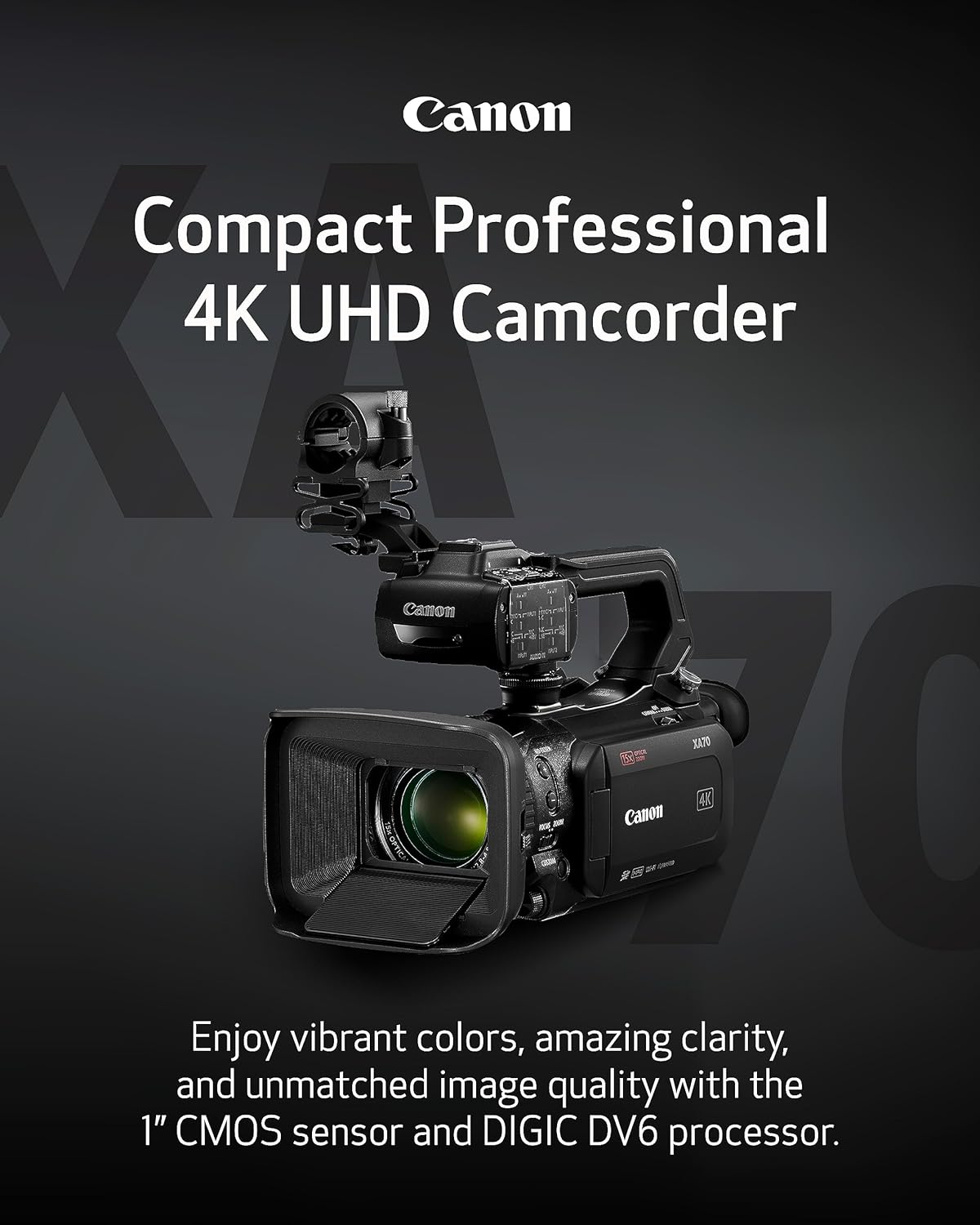 SHOOT, RECORD, STREAM: Capture breathtaking 4K UHD videos in multiple formats to bring your stories to life with the compact and powerful Canon XA70 Pro Camcorder STUNNING 4K UHD & FULL HD IMAGES: Experience unmatched image quality thanks to the 1" CMOS sensor and DIGIC DV6 processor that brings every detail to life with vibrant colors and amazing clarity VERSATILE CONNECTIVITY: Effortlessly share your videos, with mini-HDMI video output that ensure seamless integration with external devices for showcasing your work on larger screens and professional setups CAPTURE EVERY DETAIL: From wide-angle shots to distant subjects, the Canon professional video camera's integrated 4K 15x optical zoom lens lets you get up close and personal for captivating videos HIGH-DEFINITION LIVE STREAMING: Share your moments as they happen with USB Type-C output and UVC* support that enables smooth HD live streaming to your PC or Mac STEADY FOOTAGE, CLEAR VISION: Say goodbye to shaky videos with infrared and optical image stabilization that delivers steady, sharp footage even in challenging shooting conditions INTUITIVE TOUCHSCREEN & EVF: Easily navigate settings, focus on your subjects, and bring your creative vision to life with the 3.5" touchscreen LCD and tiltable OLED EVF FLEXIBLE RECORDING FORMATS: Choose between XF-AVC and MP4 recording formats for greater shooting versatility and flexibility, plus record in stunning 4K UHD 160Mbps at 30P/24P or Full HD 45Mbps at 60P/60i/30P/24P SIMULTANEOUS RECORDING: Never miss a moment with dual SD card slots that enable relay and simultaneous recording, ensuring that you never miss a moment of the action PROFESSIONAL AUDIO CONTROL: Experience next-level sound with 2 XLR terminals on the detachable handle and 4-channel linear PCM that provide pro-level audio options for pristine sound qualityView Morespecifications